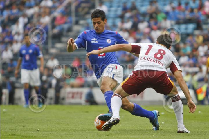 MÉXICO, D.F., 21ABRIL2012.- Con goles de Gerardo Flores al minuto 33, autogol de Juan Carlos Leaño al 43, dos de Edixon Perea al 62 y 73 e Israel Castro al 84, la Máquina Celeste de Cruz Azul goleo 5-2 a los Estudiantes de la UAdeG, en partido de la jornada 16 del Clausura 2012, disputado en el estadio Azul. En la imagen, Carlos Vela, delantero de Cruz Azul, elude la marca de José Antonio Castro, de Estudiandes. FOTO: ISAAC ESQUIVEL /CUARTOSCURO.COM