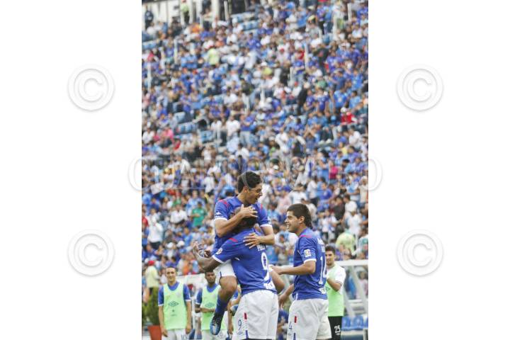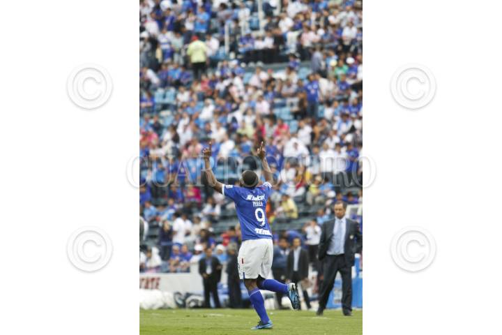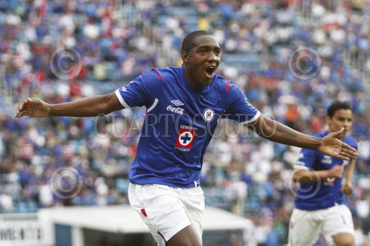 mÉXICO, D.F., 21ABRIL2012.- Con goles de Gerardo Flores al minuto 33, autogol de Juan Carlos Leaño al 43, dos de Edixon Perea al 62 y 73 e Israel Castro al 84, la Máquina Celeste de Cruz Azul goleo 5-2 a los Estudiantes de la UAdeG, en partido de la jornada 16 del Clausura 2012, disputado en el estadio Azul. En la imagen, Edixon Perea celebra uno de sus tantos. FOTO: ISAAC ESQUIVEL /CUARTOSCURO.COM