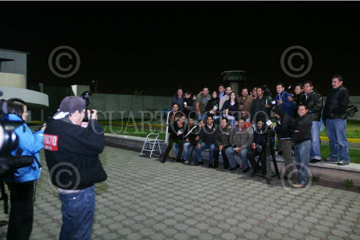MÉXICO, D.F., 27AGOSTO2010.- Así posaron los reporteros de la sección de espectáculos de distintos medios de comunicación después de tener más de cinco horas de espera para la salida de Celia Lora, hija del rockero Alex Lora y que fuera sentenciada a poco más de cuatro años por homicidio imprudencial, pero que un juez le fijará una fianza para que saliera en libertad, esto en el Penal de Santa Martha Acatitla, sin embargo, la ex-reclusa salió escondida dentro de un vehículo oficial para evitar los cuestionamientos de la prensa. FOTO: LUZ ACEVEDO/CUARTOSCURO.COM