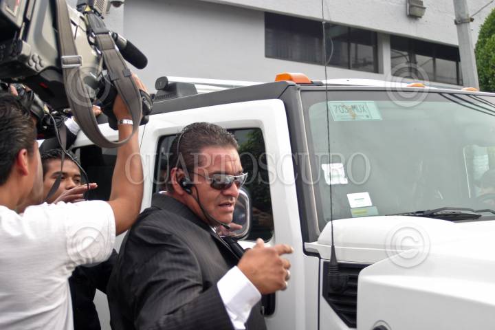 MÉXICO, D.F., 30AGOSTO2010.- La camioneta Hummer de Celia Lora acompañada por su hija del mismo nombre (acusada de homicidio imprudencial), es custodiada por su equipo de seguridad a la salida del programa de Laura Bozzo en las instalaciones de TV Azteca. FOTO: MISAEL VALTIERRA/CUARTOSCURO.COM