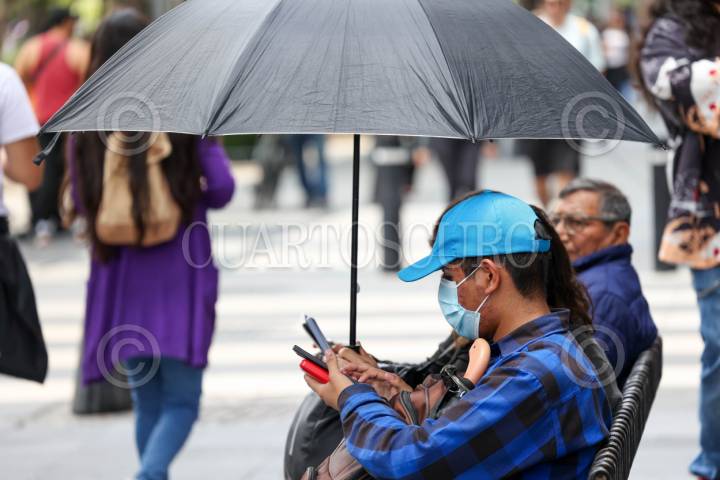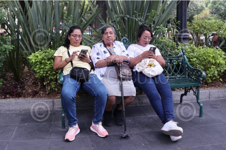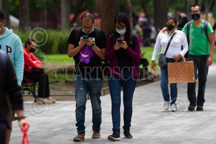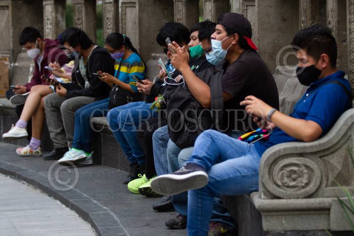 CIUDAD DE MÉXICO, 29JUNIO2025.- Personas usan sus celulares en una banca de avenida Juárez. Se estima que México este año alcanzarán los cien millones de personas que cuenten con al menos uno de estos dispositivos. FOTO: MOISÉS PABLO/CUARTOSCURO.COM