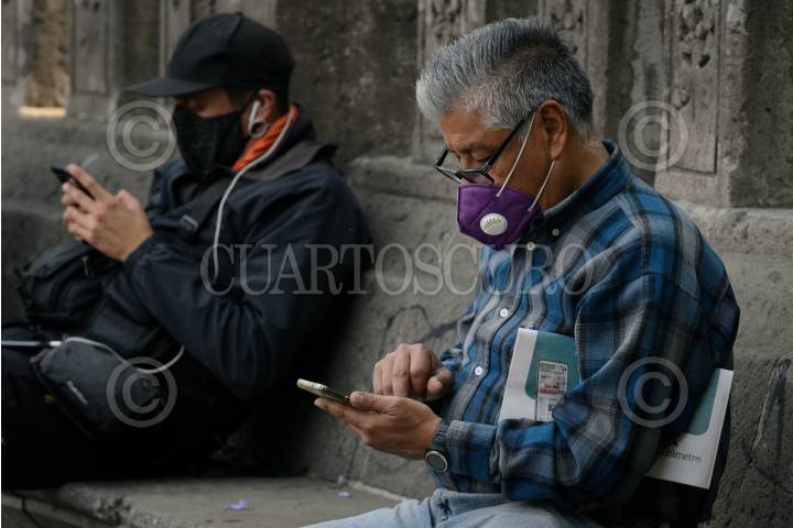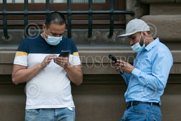 Dos hombres utilizan su teléfono celular en las inmediaciones del Centro Histórico.