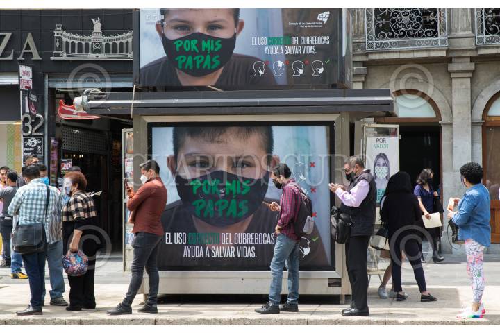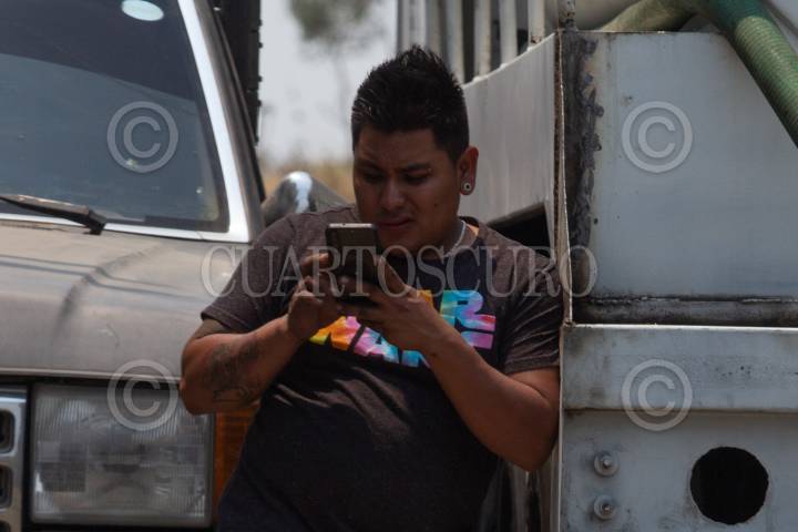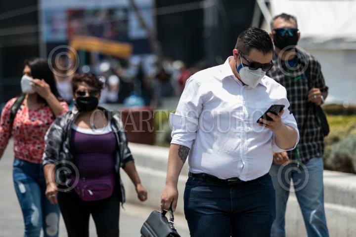 Viajantes usan su celular o teléfono inteligente en la estación Hamburgo del Metrobús.