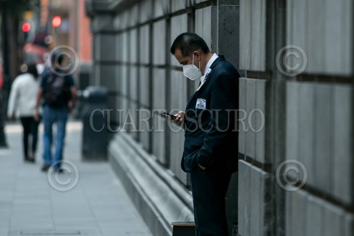 Un empleado de seguirdad privada utiliza su dispositivo móvil en calles del Centro Histórico.