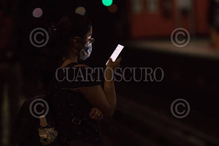 Una mujer usa su celular mientras espera la llegada del tren en el metro Juárez.
