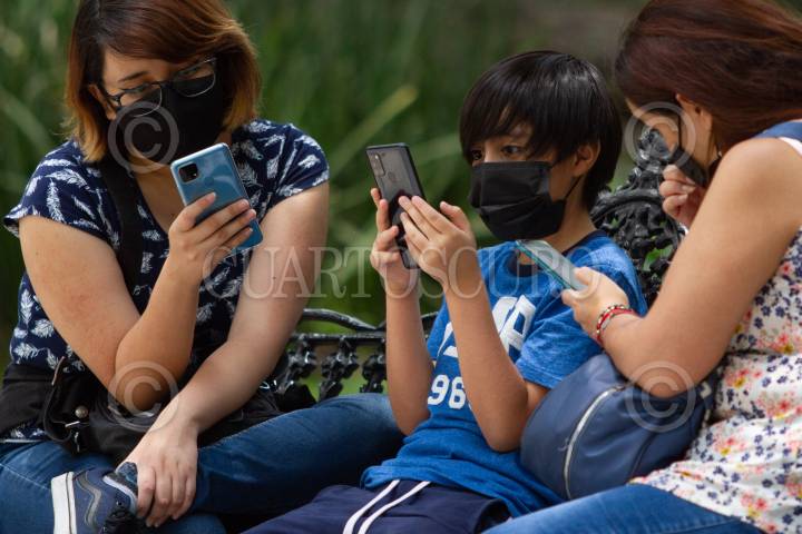 CIUDAD DE MÉXICO, 25MAYO2025.- Un niño acompañado de su padre observan su celular en la Alameda Central. En México pasamos ocho horas diarias en el celular: todo ese tiempo es para TikTok, Instagram, Facebook, jugar y ver series. México es uno de los países que pasa más tiempo frente a la pantalla del celular. FOTO: GRACIELA LÓPEZ/CUARTOSCURO.COM