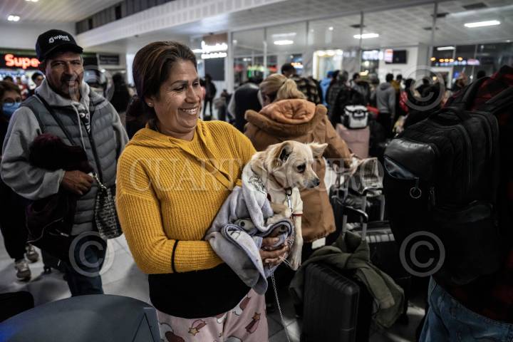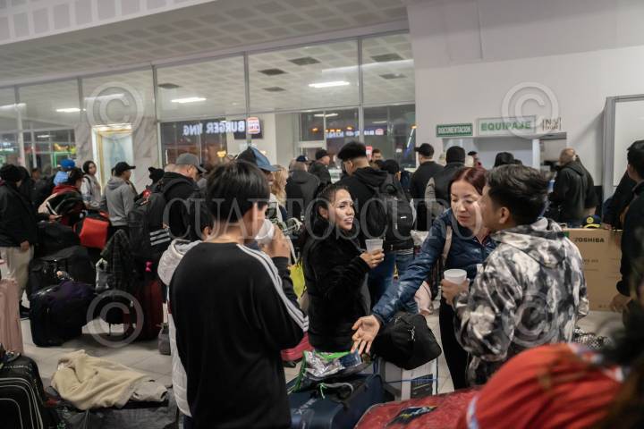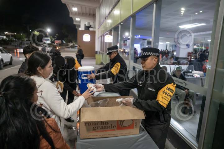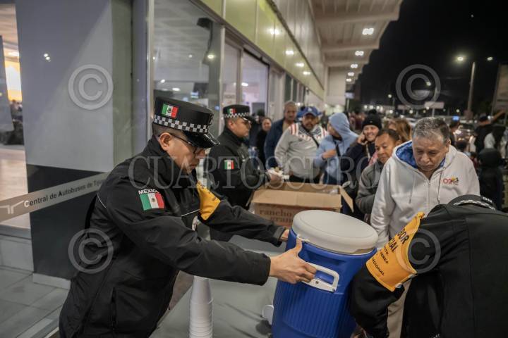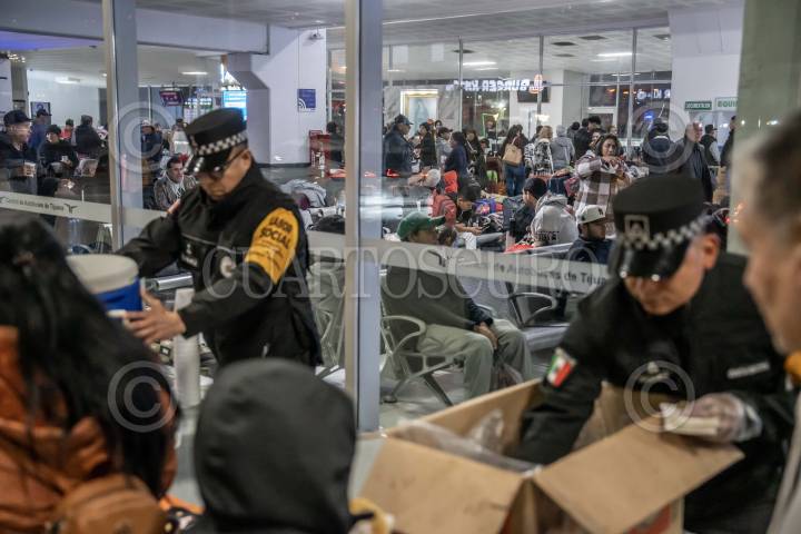 TIJUANA, BAJA CALIFORNIA, 22DIC2024.-A unos días del día de Navidad, la central camionera de Tijuana luce abarrotada por personas que intentan llegar con sus seres queridos para pasar las fechas decembrina. Cómo parte del apoyo, agentes de la Guardia Nacional, realizan rondines de vigilancia y regalaron café y pan a las personas que se encontraban esperando su camión durante la noche fría del fin de semana. Edith, quien va a viajar hacia la Ciudad de México, comentó que muchos de los camiones se encontraban retardados, por lo que las personas estaban desesperadas y el café y el pan que los agentes les regalaron, les ayudaron a pasar mejor la espera de hasta cuatro horas. “Se me hizo bonito detalle que la Guardia Nacional pusiera café, se ve que están haciendo su labor, sirve para la espera”, comentó, agregando que espera por el retraso alcanzar a llegar llegar a medio día de navidad. Por su parte Adolfo, quien iba a viajar a Hermosillo, expresó que él pasaría toda la noche en la Central, ya que le habían comentado que su camión saldría hasta la mañana. “La intención es la proximidad social, lo hacemos con toda la fe del mundo y lo que tratamos es de fortalecer la relación con la sociedad, es un gesto bonito y vamos a seguir implementando esta estrategia”, comentó Brandon Daniel Barrera, agente de la Guardia Nacional. Agregando que su deseo es que la población deje de tenerle miedo a las autoridades y se les acerquen para que les informen sobre la situación de la ciudad. OMAR MARTÍNEZ/ CUARTOSCURO.COM