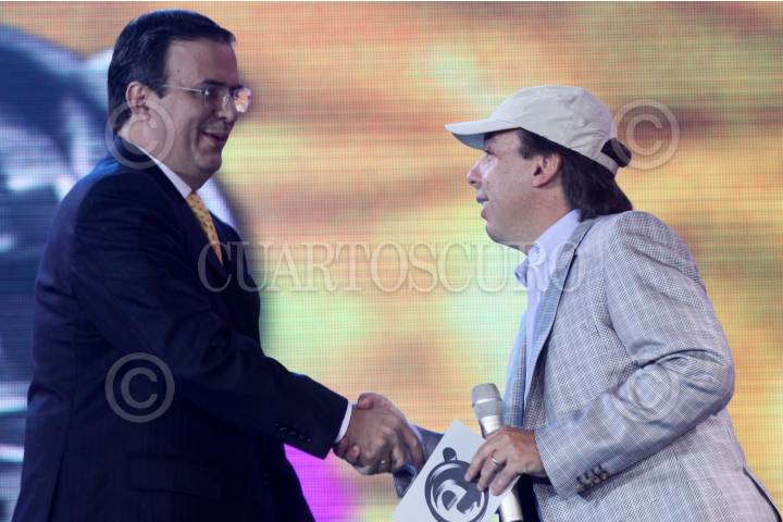 MÉXICO, D.F., 31MARZO2009.-Emilio Azcárraga Jean, presidente de Grupo Televisa saluda a Marcelo Ebrard Jefe de Gobierno del Distrito Federal previo a su participación donde el jefe capitalino habló ante cientos de jóvenes que asistierona espacio universitario que se realiza en el World Trade Centrer. FOTO: SÁSHENKA GUTIERREZ/CUARTOSCURO.COM