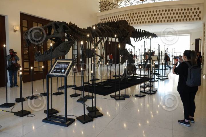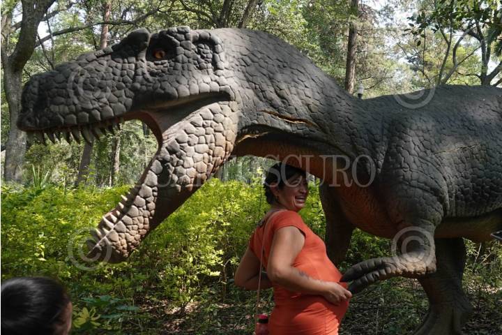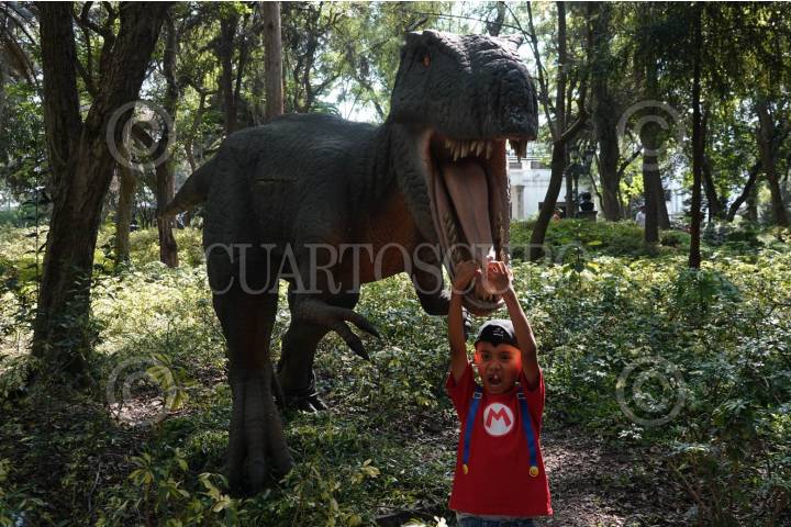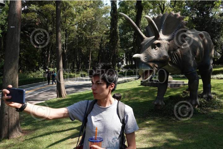 Capitalinos interactuaron con las esculturas de los dinosaurios de la exposición "Dinos en los Pinos", inaugurada esta tarde en el Centro Cultural Los Pinos