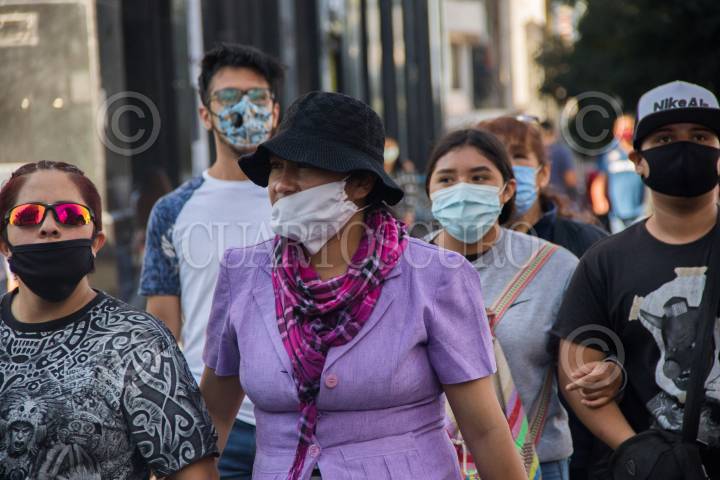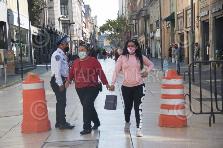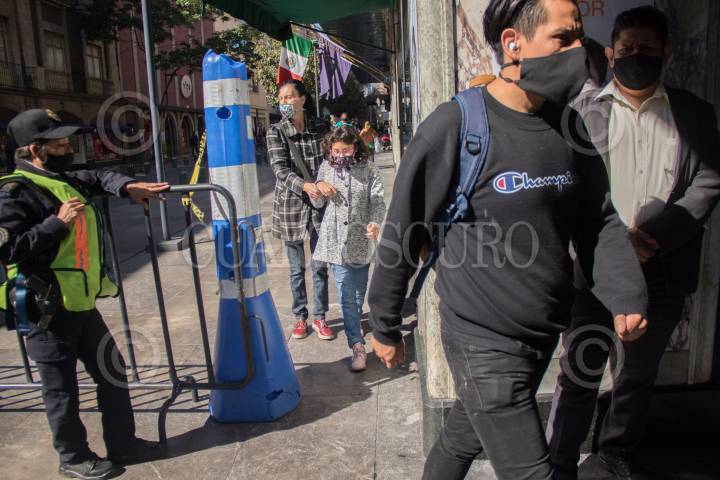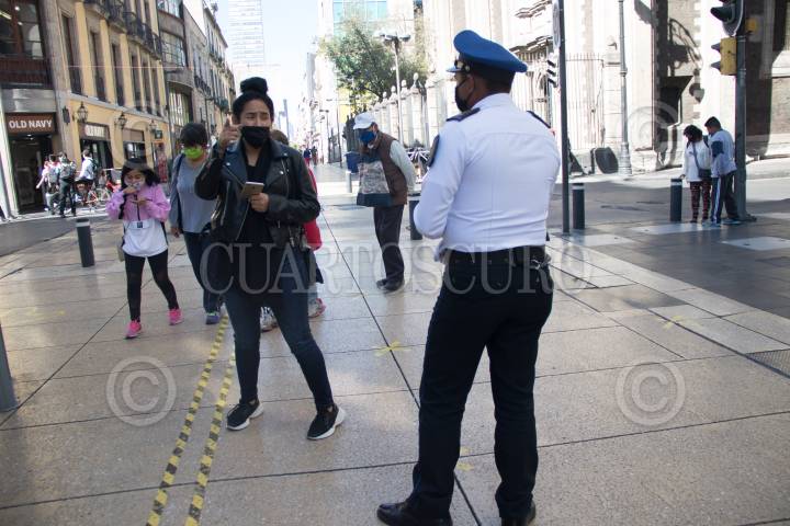 Una mujer camina en la calle Donceles en el Centro Histórico.
