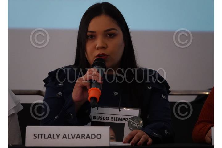 Paola Alvarado familiares de: Rocío Irene Alvarado Reyes, Nitza Paola Alvarado Espinoza y José Ángel Alvarado Herrera, víctimas de desaparición forzada en 2009 durante la conferencia de prensa en el Centro Prodh