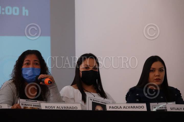 Rosy Alvarado; Paola Alvarado y Sitlaly Alvarado, familiares de: Rocío Irene Alvarado Reyes, Nitza Paola Alvarado Espinoza y José Ángel Alvarado Herrera (víctimas de desaparición forzada en 2009) durante la conferencia de prensa en el Centro Prodh