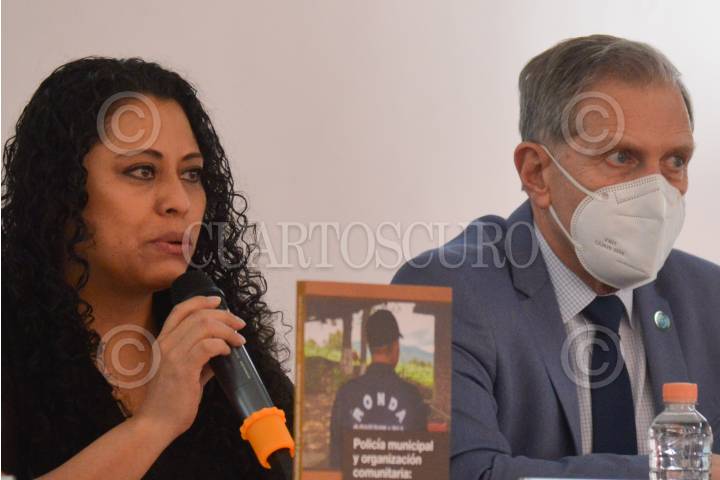 Cinthya García, Colaboradora de CIAS por la Paz, y Guillermo Fernández Maldonado, representante de ONU-DH México, durante la presentación de los resultados del estudio "Policía municipal y comunidad organizada: Un desafío para la paz”.