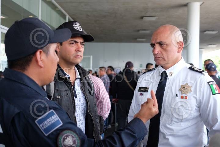 CIUDAD DE MÉXICO, 09JULIO2019.- Elementos de la Policía Federal que buscan información sobre otras dependencias acudieron a las mesas de reclutamiento que se instalaron en el área del comedor del Centro de Mando de la Policía Federal. En la imagen, Benjamín Grajeda Regalado, titular de la División de Gendarmería de la Policía Federal, conversó con policías que acudieron a recibir información. FOTO: GRACIELA LÓPEZ /CUARTOSCURO.COM