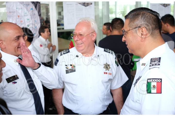 CIUDAD DE MÉXICO, 09JULIO2019.- Elementos de la Policía Federal que buscan información sobre otras dependencias acudieron a las mesas de reclutamiento que se instalaron en el área del comedor del Centro de Mando de la Policía Federal. En la imagen, Benjamín Grajeda Regalado, titular de la División de Gendarmería de la Policía Federal; Ángel González, titular de la División de Seguridad Regional de la Policía Federal y Raúl Avila Ibarra, comisionado de Fuerzas Federales de la Policia Federal, conversaron durante las mesas de reclutamiento. FOTO: GRACIELA LÓPEZ /CUARTOSCURO.COM