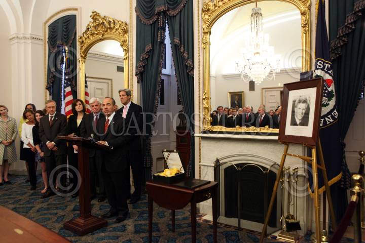 WASHINGTON, D.C., ESTADOS UNIDOS, 20MAYO2010.- Felipe Calderón Hinojosa, presidente de México, durante la ceremonia de entrega postuma de la condecoración de la orden mexicana del aguila azteca al senador Edward Kennedy, que recibió Victoria Kennedy, viuda del senador Kennedy, que tuvo lugar en el salón S116 del capitolio. FOTO: ALFREDO GUERRERO/CUARTOSCURO.COM