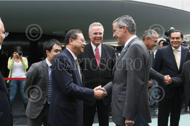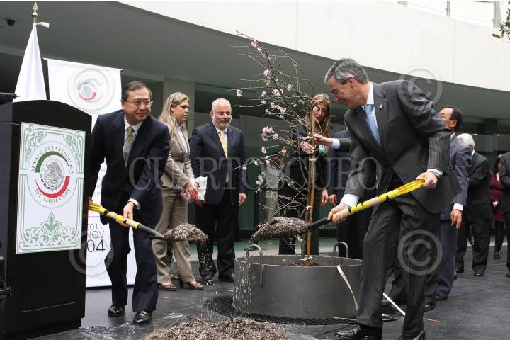 MÉXICO, D.F., 04NOVIEMBRE2011.- Shuichiro Megata, embajador de Japón, y José González Morfín, presidente de la mesa directiva del Senado, plantaron un árbol de cerezo en la explanada del Senado que fue donado por el pueblo japones. FOTO: CUARTOSCURO.COM