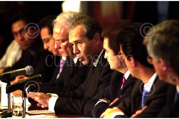 Pedro Cerisola, secretario de Comunicaciones y Tranportes, junto con Felipe Calderón Hinojosa, director general del Banco Nacional de Obras y Servicios Públicos, firmaron un acuerdo de Constitución del Fondo Carretero, durante el programa de Desarrollo de Aupistas de Cuota para la Mosernización de Corredores en el 2003. FOTO: Eunice Adorno/CUARTOSCURO.COM