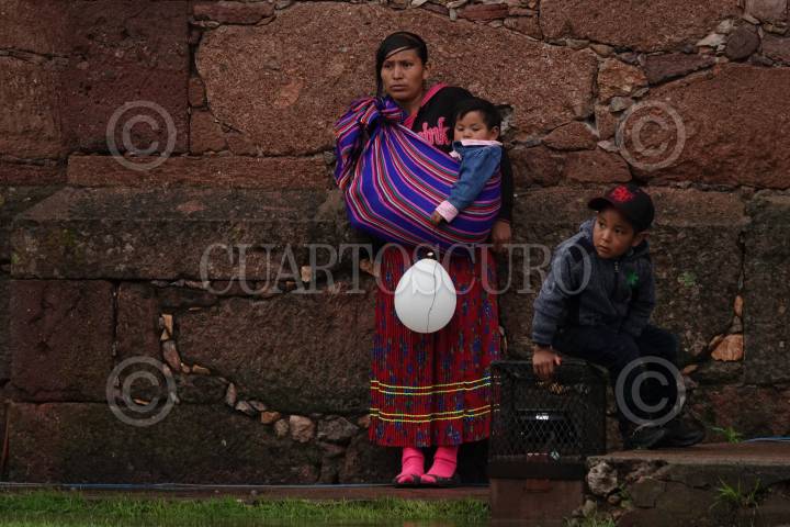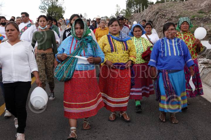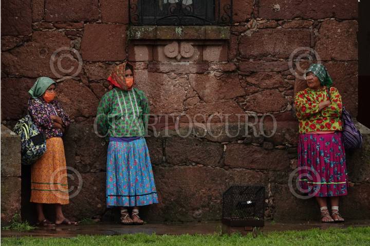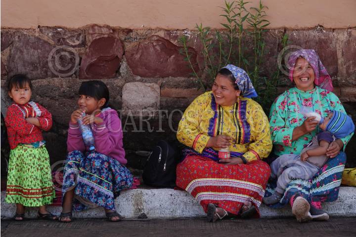 Mujeres y niñas rarámuri conversan y ríen en Cerocahui, en el municipio de Urique de la Sierra Tarahumara