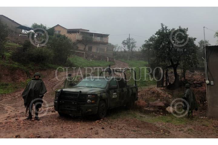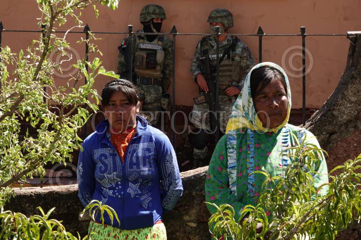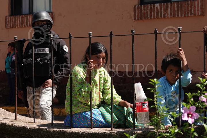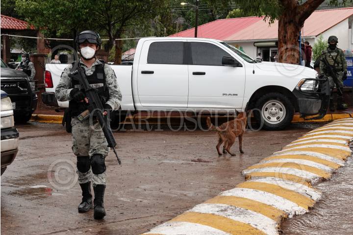 Elementos de la Guardia Nacional resguardan Cerocahui, luego de que le quitaran la vida a los sacerdotes jesuitas Joaquín César Mora Salazar, de 80 años, y Javier Campos Morales, de 79, dentro del templo de esta comunidad