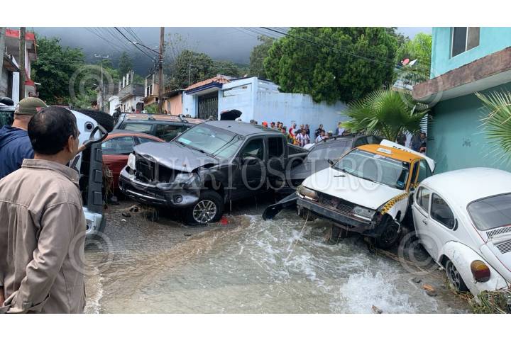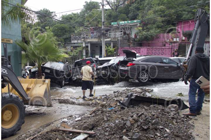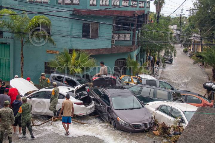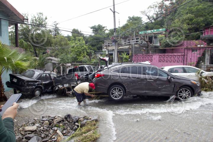 GUADALUPE, NUEVO LEÓN, 17OCTUBRE2024.- Las fuertes lluvias registradas durante la madrugada del jueves, provocó que 13 vehículos que se encontraban estacionados fueran arrastrados por la corriente y se apilaran entre sí, en la colonia Nuevo México, en las faldas del cerro de la silla. Se estima que las lluvias continúen al menos dos días más en el área metropolitana de Monterrey. FOTO: GABRIELA PÉREZ MONTIEL / CUARTOSCURO.COM