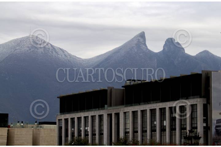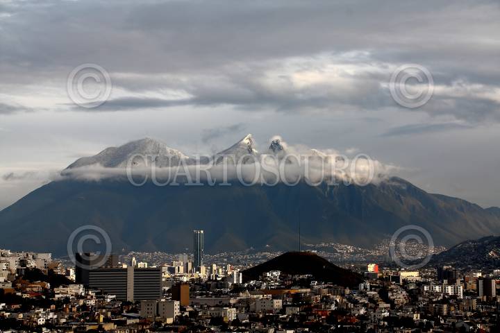 Vista del Cerro de la Silla desde el centro de Monterrey, cubierto de hielo en la parte alta, debido a las bajas temperaturas que se han registrado en el estado de Nuevo León.