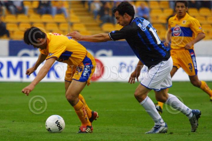 Monterrey, N. L. Mexico 07Febrero2004.- El jugador de Tigres Mario Ruiz y el Jugador de Queretaro Jorge Cervera, disputan un balon durante el juego de la Jornada 4 del Torneo Clausura 2004. FOTO: JORGE LOPEZ/CUARTOSCURO.COM