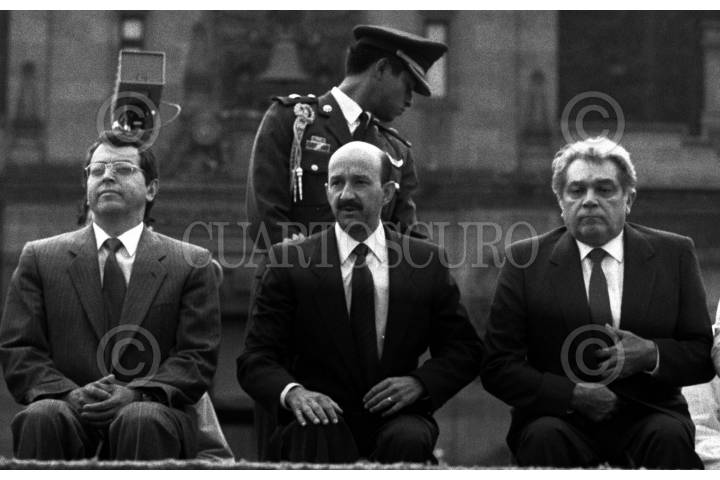 México 18AGOSTO 2004.- El ex gobernador de Yucatán, Víctor Cervera Pacheco, falleció la mañana de hoy víctima de un infarto, a los 68 años de edad. En imagen de archivo del 5 de Agosto de 1990, Manuel Camacho Solis y el presidente Carlos Salinas acompañan a Cervera Pacheco. FOTO: ELOY VALTIERRA/CUARTOSCURO.COM