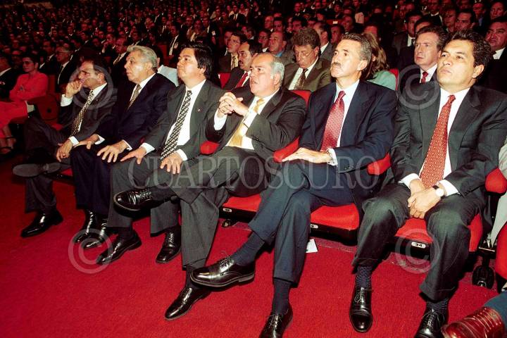 Los gobernadores de Yucaan y Taasco, Victor Cervera y Roberto Madrazo respectivamente, durante el primer Informe de Gobierno de Arturo Montiel. FOTO: Eduardo Loza/CUARTOSCURO.COM