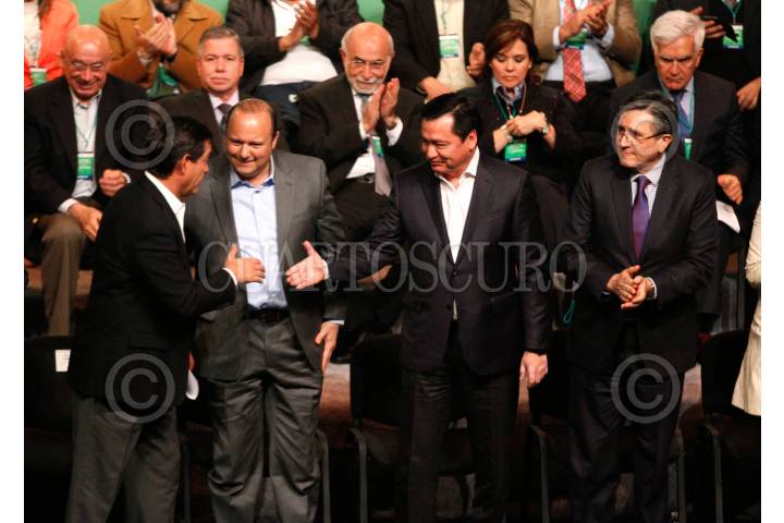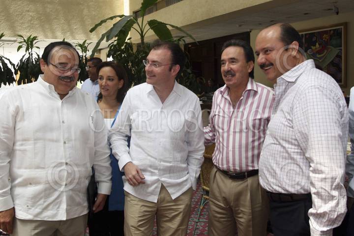 CHIHUAHUA, CHIHUAHUA, 21AGOSTO2012.- Los priistas Jorge Carlos Ramírez Marín, Luis Videgaray, coordinador general de políticas públicas del PRI, Emilio Gamboa, próximo coordinador de los senadores, y César Horacio Duarte Jáquez, gobernador del estado, durante su reunión plenaria de la LXII Legislatura. FOTO: CUARTOSCURO.COM