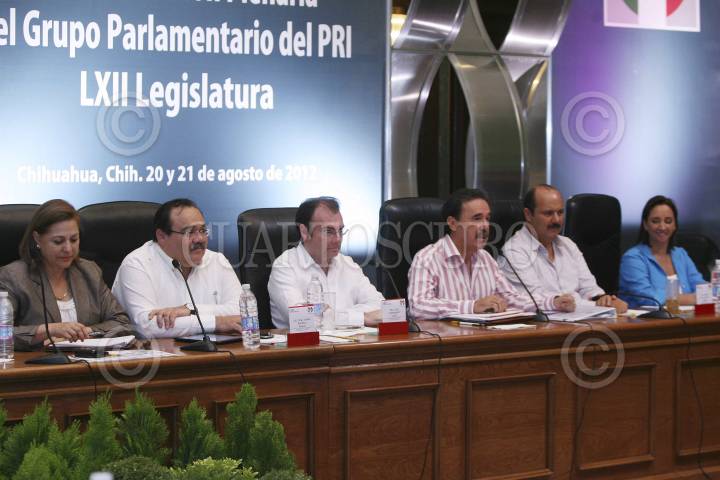 CHIHUAHUA, CHIHUAHUA, 21AGOSTO2012.- Los priistas Luis Videgaray, coordinador general de políticas públicas del PRI, Emilio Gamboa, próximo coordinador de los senadores, y César Horacio Duarte Jáquez, gobernador del estado, durante su reunión plenaria de la LXII Legislatura. FOTO: CUARTOSCURO.COM
