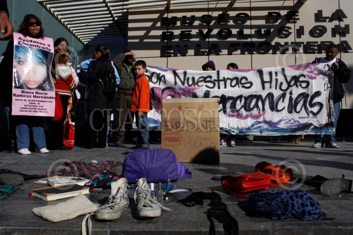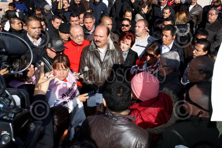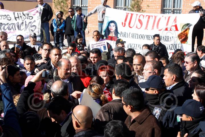CIUDAD JUÁREZ, CHIHUAHUA, 02FEBRERO2013.- Un grupo nutrido de madres y padres de familia, así como, menores de edad, se dieron cita desde temprano para esperar a ser atendidos por el Gobernador del Estado, Cesar Horacio Duarte Jaquéz, esto justo en la plaza Misión de Guadalupe, que se ubica en la zona donde la mayoría de mujeres han desaparecido. A su llegada Duarte manifestó que "esta reunión es un encuentro muy importante lo que yo puedo confirmar es que la gran mayoría de los crímenes se han aclarado, quiero reconocer el trabajo que se hace dentro de la dependencia, y haremos lo posible para que se aclaren los hechos sucedidos en esta frontera". En el lugar lo presentes estuvieron lanzando consignas en contra del gobierno por las nulas acciones de búsqueda de las mujeres desaparecidas. FOTO: NACHO RUÍZ /CUARTOSCURO.COM