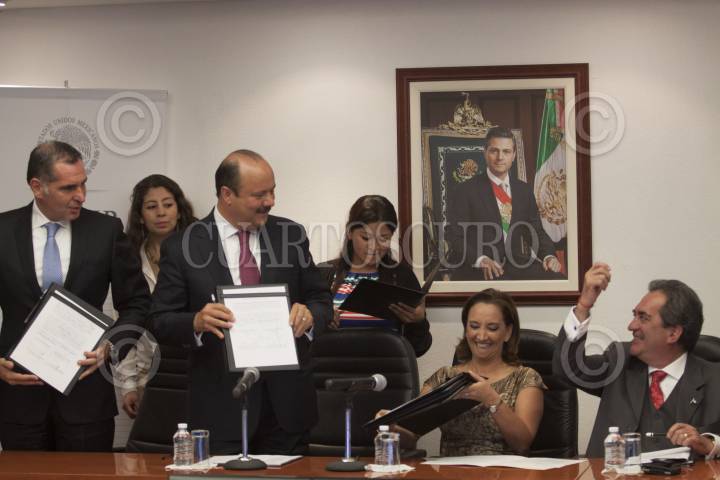 MÉXICO, D.F, 04ABRIL2013.- César Horacio Duarte Jaquez, goberandor de Chihuahua, Claudia Ruíz Massieu, secretaria de Turismo, y Carlos Lozano de la Torre, gobernador de Aguascalientes, durante la firma de convenio de reasignación de recursos. FOTO: MOISÉS PABLO /CUARTOSCURO.COM
