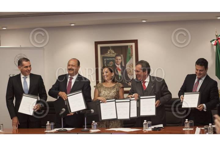 MÉXICO, D.F, 04ABRIL2013.- Gabino Cué Monteagudo, gobernador de Oaxaca, César Horacio Duarte Jaquez, goberandor de Chihuahua, Claudia Ruíz Massieu, secretaria de Turismo, Carlos Lozano de la Torre, gobernador de Aguascalientes, y Jorge Aristoteles Sandoval, gobernador de Jalisco, durante la firma de convenio de reasignación de recursos. FOTO: MOISÉS PABLO /CUARTOSCURO.COM