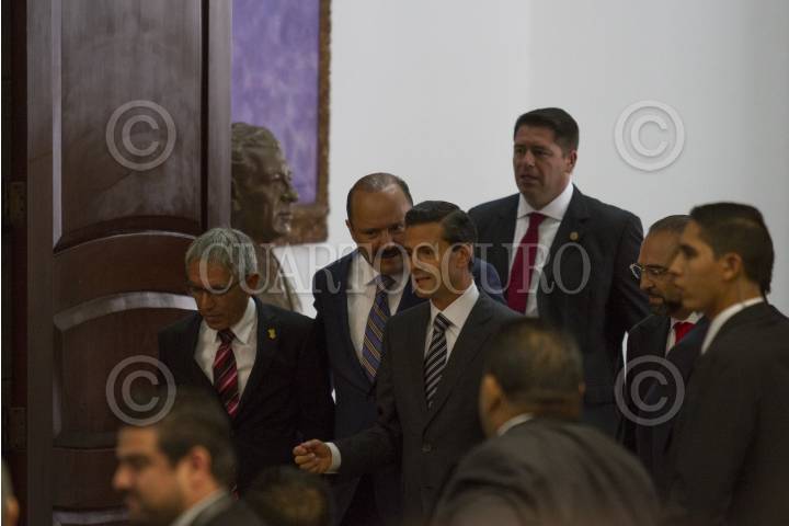 MÉXICO, D.F., 17JULIO2015.- Salvador Jara Guerrero, gobernador de Michoacán, César Horacio Duarte Jáquez, gobernado de Chihuahua, Enrique Peña Nieto, Presidente de México, y Eugenio Baeza Fares, presidente del consejo administrativo y director general del Grupo Bafar, durante el anuncio de inversión del Grupo Bafar en una planta agroindustrial en la Piedad, Michoacán, que se realizó en el salón Adolfo López Mateos de la Residencia de Los Pinos. FOTO: MOISÉS PABLO /CUARTOSCURO.COM