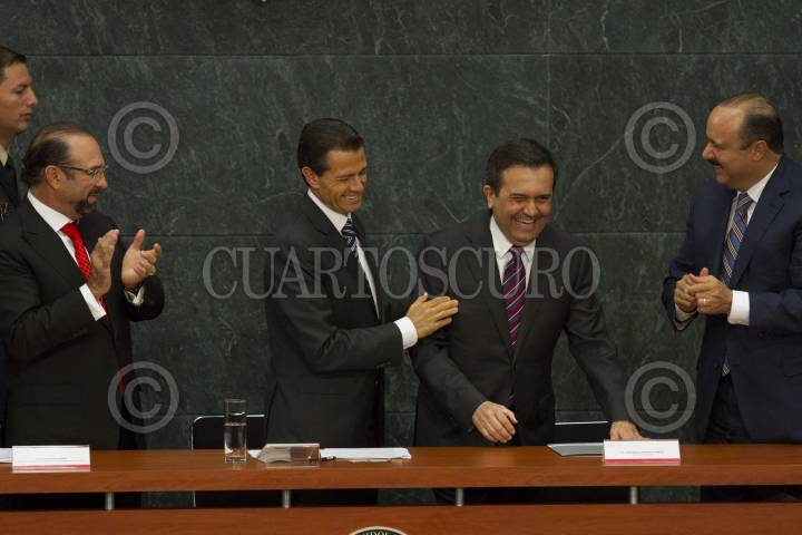 MÉXICO, D.F, 04ABRIL2013.- Gabino Cué Monteagudo, gobernador de Oaxaca, César Horacio Duarte Jaquez, goberandor de Chihuahua, Claudia Ruíz Massieu, secretaria de Turismo, y Carlos Lozano de la Torre, gobernador de Aguascalientes, durante la firma de convenio de reasignación de recursos. FOTO: MOISÉS PABLO /CUARTOSCURO.COM