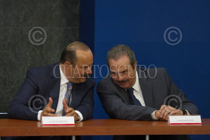 MÉXICO, D.F, 04ABRIL2013.- Gabino Cué Monteagudo, gobernador de Oaxaca, y César Horacio Duarte Jaquez, goberanador de Chihuahua, durante la firma de convenio de reasignación de recursos con la Secretaría de Turismo. FOTO: MOISÉS PABLO /CUARTOSCURO.COM