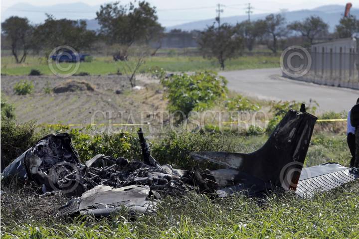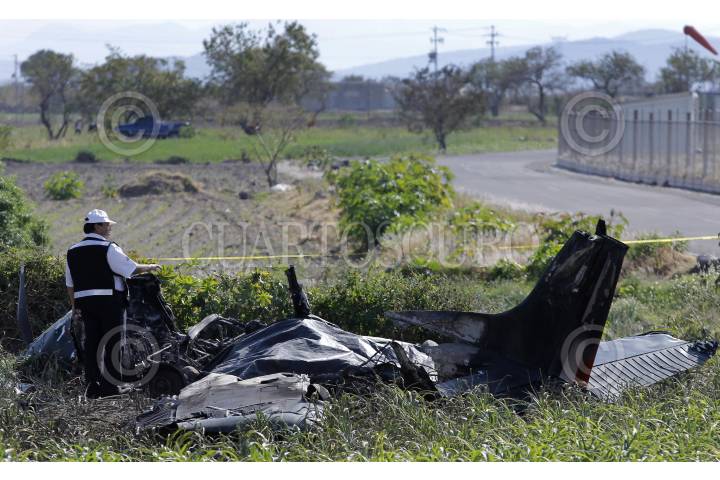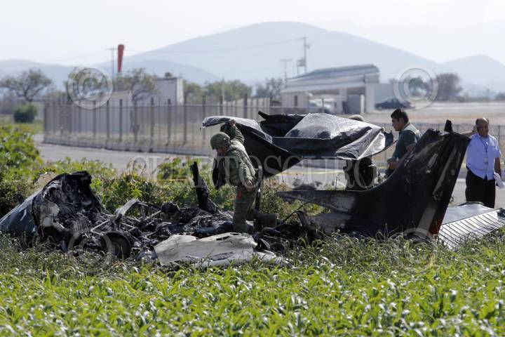 ATLIXCO, PUEBLA, 14ENERO2014.- Una avioneta del ejército mexicano que presentó fallas mecánicas se incendió tras un intento de aterrizaje; según reportes de la unidad de protección civil estatal la avioneta se desplomó alrededor de las 13:00 horas junto al aeródromo ubicado en la comunidad de La Trinidad Tepango, perteneciente al municipio de Atlixco. El saldo oficial dado a conocer por las autoridades fue de dos lesionados, mismos que fueron trasladados al nosocomio mas cercano a la región y un cuerpo calcinado al interior de la nave. FOTO: HILDA RÍOS /CUARTOSCURO.COM