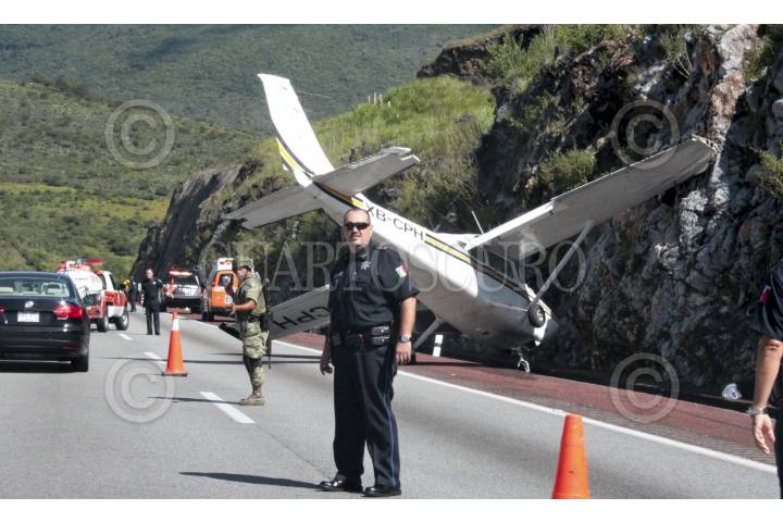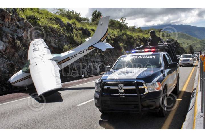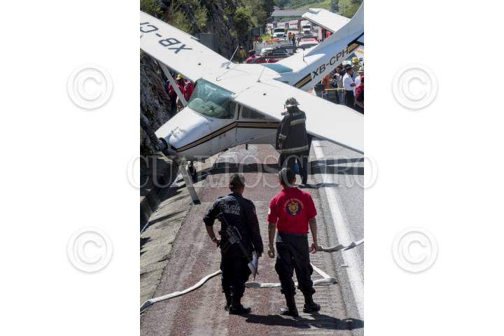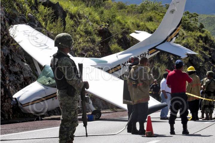 CHILPANCINGO, GUERRERO, 28AGOSTO2013.- Una avioneta que volaba del puerto de Acapulco con destino a Cuernavaca Morelos, el piloto y el copiloto tuvieron que hacer un aterrizaje forzoso debido a una supuesta falla mecánica tuvieron que aterrizar en uno de los carriles dela autopista del sol. El aterrizaje se llevó acabo en el kilómetro 288, a la altura de la población Palo Blanco municipio de Chilpancingo. La Aeronave se impactó contra un cerro, en esta acción hizo presencia el ejército mexicano, policía municipal, estatal y elementos de protección civil. FOTO: JOSE I HERNÁNDEZ /CUARTOSCURO.COM