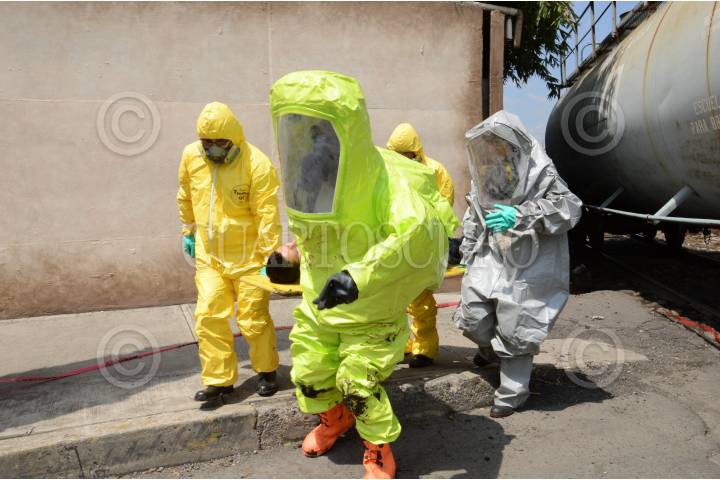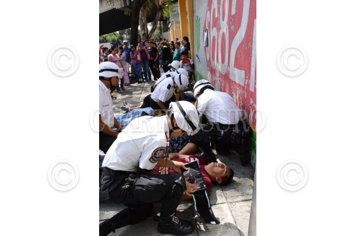 MEXICO, D.F., 19SEPTIEMBRE2015.- La Procuraduría Social del Distrito Federal junto con la Secretaría de Seguridad Pública y diversas asociaciones de Protección Civil realizaron sobre la avenidad Ceylán, ubicada en la colonia Vallejo Industrial, ejercicios de evacuación, repliegue, seguridad y reacción ciudadana ante un posible sismo, esto con motivo de la conmemoración de los 30 años del terremoto de 1985. En la imagen integrantes de la asociación civil "Guardias de México" ayudan a los "heridos" durante el simulacro. FOTO: GALO CAÑAS /CUARTOSCURO.COM