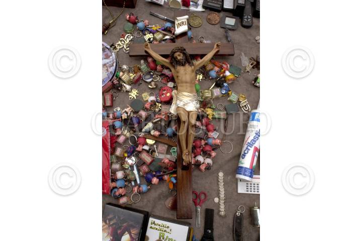 México D.F., 02ABR2004.- Un Cristo en las chacharas, donde se puede encontrar llaveros, peliculas, controles remotos y mil cosas mas. FOTO: Edgar Rodríguez/CUARTOSCURO.COM