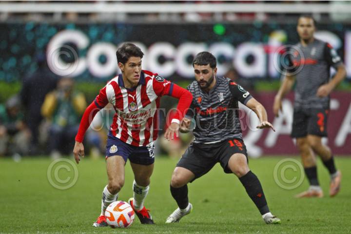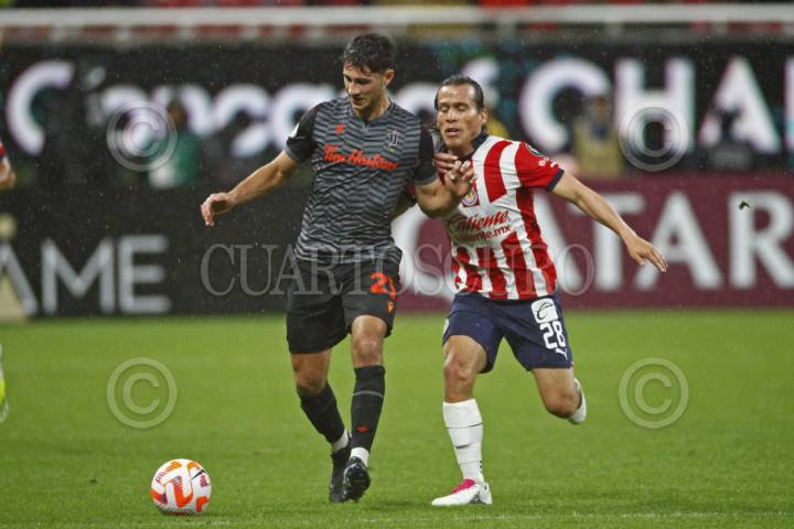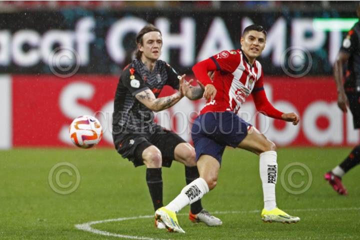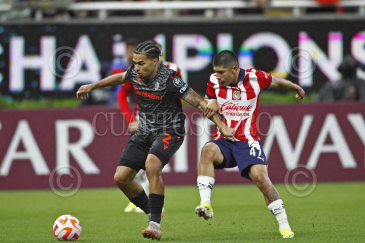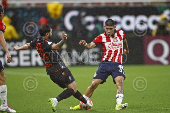 ZAPOPAN, JALISCO, 13FEBRERO2024.- El Jugador de Chivas, Rolando Cisneros, disputa el balón con el contrario de Forge F.C. Alexander Achinioti-Jönsson, esto en partido correspondiente a los dieciseisavos de final de Vuelta de la Concacaf Champions Cup, en donde se enfrentan los equipos de Chivas (México) vs Forge F.C. (Canadá), en juego que se lleva a cabo en el Estadio Akron, el marcador Global al final es de 5-1, a favor del equipo Mexicano, quien pasa a la siguiente ronda. FOTO: FERNANDO CARRANZA GARCIA / CUARTOSCURO.COM