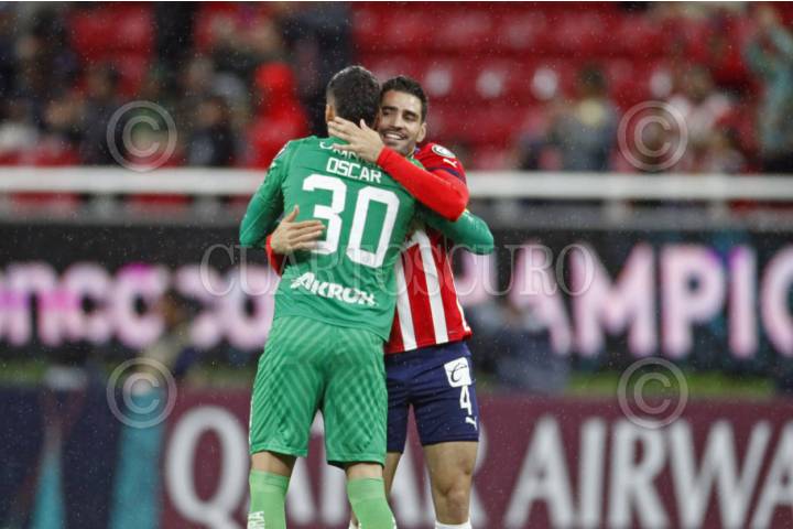 ZAPOPAN, JALISCO, 13FEBRERO2024.- Antonio Briseño y el Guardameta Oscar Whalley, Jugadores de Chivas, celebran su pase a la siguiente ronda, esto en partido correspondiente a los dieciseisavos de final de Vuelta de la Concacaf Champions Cup, en donde se enfrentan los equipos de Chivas (México) vs Forge F.C. (Canadá), en juego que se lleva a cabo en el Estadio Akron, el marcador Global al final es de 5-1, a favor del equipo Mexicano, quien pasa a la siguiente ronda. FOTO: FERNANDO CARRANZA GARCIA / CUARTOSCURO.COM