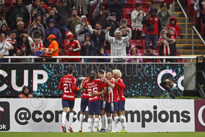 ZAPOPAN, JALISCO, 13FEBRERO2024.- José Castillo, Jugador de Chivas celebra su anotación, esto en partido correspondiente a los dieciseisavos de final de Vuelta de la Concacaf Champions Cup, en donde se enfrentan los equipos de Chivas (México) vs Forge F.C. (Canadá), en juego que se lleva a cabo en el Estadio Akron, el marcador Global al final es de 5-1, a favor del equipo Mexicano, quien pasa a la siguiente ronda. FOTO: FERNANDO CARRANZA GARCIA / CUARTOSCURO.COM