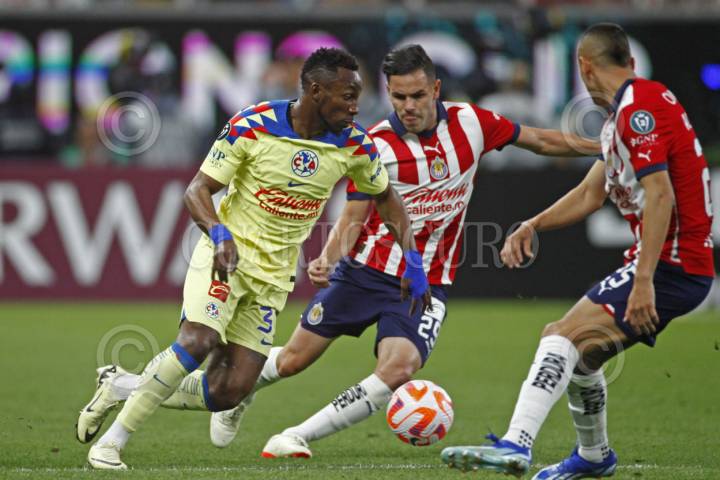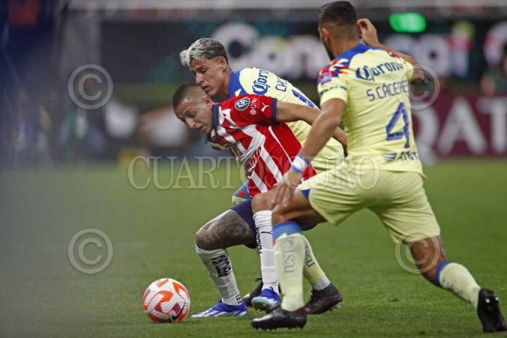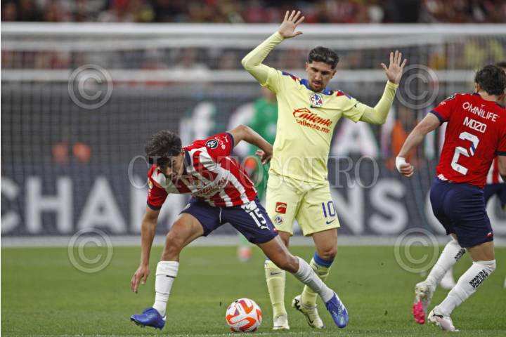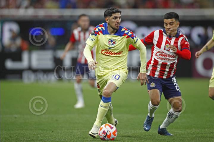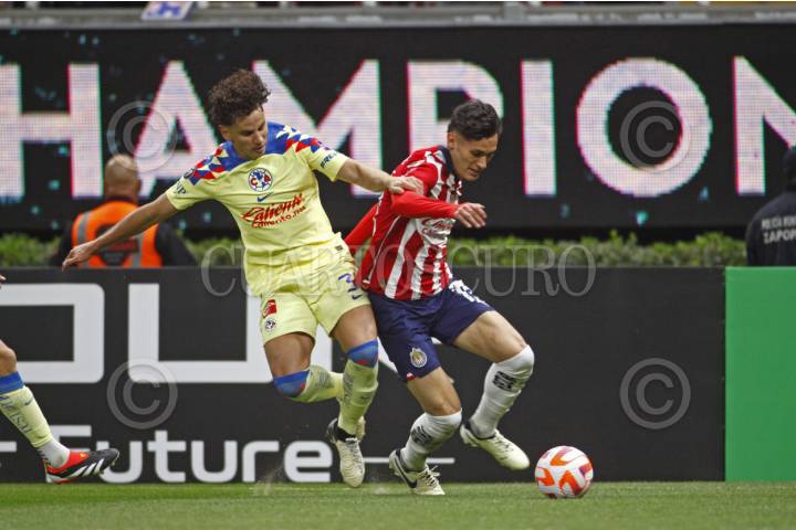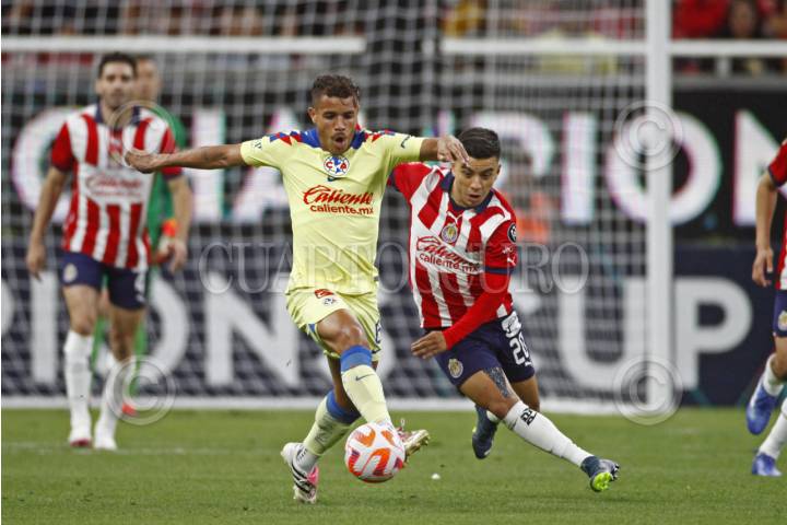 ZAPOPAN, JALISCO, 06MARZO2024.- Julián Quiñonez jugador de América, disputa el balón con el contrario de Chivas, Alan Torres. esto en partido correspondiente a los Octavos de final de Vuelta de la Concacaf Champions Cup, en donde se enfrentan los equipos de Chivas (México) vs América (México), en juego que se lleva a cabo en el Estadio Akron, el marcador al momento es de 1-0, a favor del equipo visitante. FOTO: FERNANDO CARRANZA GARCIA / CUARTOSCURO.COM