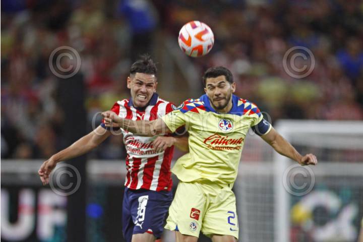 ZAPOPAN, JALISCO, 06MARZO2024.- Henry Martín jugador de América, disputa el balón con el contrario de Chivas, Alan Torres. esto en partido correspondiente a los Octavos de final de Vuelta de la Concacaf Champions Cup, en donde se enfrentan los equipos de Chivas (México) vs América (México), en juego que se lleva a cabo en el Estadio Akron, el marcador al momento es de 1-0, a favor del equipo visitante. FOTO: FERNANDO CARRANZA GARCIA / CUARTOSCURO.COM