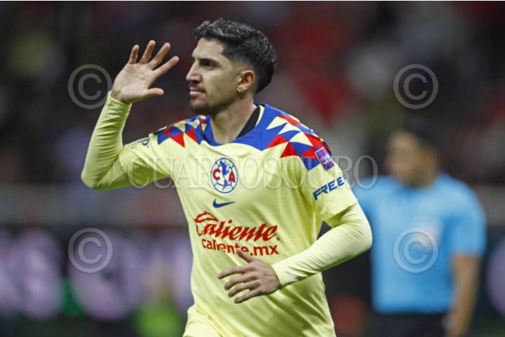 ZAPOPAN, JALISCO, 06MARZO2024.- Diego Valdez jugador de América, celebra su anotación, esto en partido correspondiente a los Octavos de final de Vuelta de la Concacaf Champions Cup, en donde se enfrentan los equipos de Chivas (México) vs América (México), en juego que se lleva a cabo en el Estadio Akron, el marcador al momento es de 2-0, a favor del equipo visitante. FOTO: FERNANDO CARRANZA GARCIA / CUARTOSCURO.COM