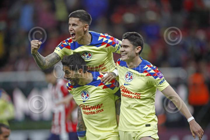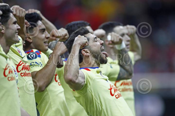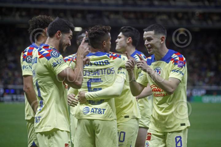 ZAPOPAN, JALISCO, 06MARZO2024.- Jugadores de América, celebran una de las anotaciones del juego, esto en partido correspondiente a los Octavos de final de Vuelta de la Concacaf Champions Cup, en donde se enfrentan los equipos de Chivas (México) vs América (México), en juego que se lleva a cabo en el Estadio Akron, el marcador al final es de 3-0, a favor del equipo visitante. FOTO: FERNANDO CARRANZA GARCIA / CUARTOSCURO.COM