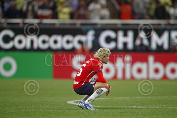 ZAPOPAN, JALISCO, 06MARZO2024.- Cade Cowell jugador de Chivas, se lamenta tras la derrota, esto en partido correspondiente a los Octavos de final de Vuelta de la Concacaf Champions Cup, en donde se enfrentan los equipos de Chivas (México) vs América (México), en juego que se lleva a cabo en el Estadio Akron, el marcador al final es de 3-0, a favor del equipo visitante. FOTO: FERNANDO CARRANZA GARCIA / CUARTOSCURO.COM