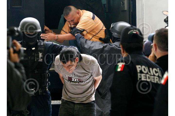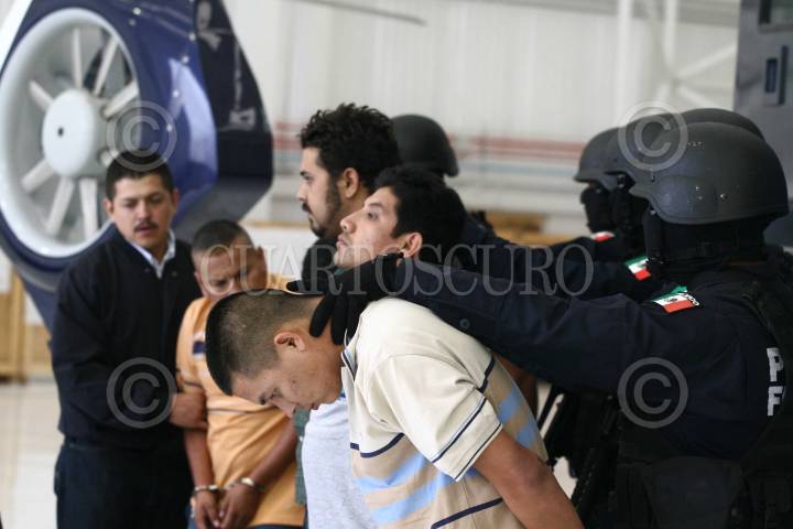 MÉXICO D.F. 26SEPTIEMBRE2009.- Elementos de la Policia Federal, presentaron ante los medios de comunicación a cuatro presuntos integrantes de la organizacion delictiva denominada "La Familia Michoacana" detenidos en el puerto de Lazaro Cardenas Michoacan. En tre ellos se encuentra Arturo Juarez Cruz alias el "Chamuco", encargado y designado para ocupar la plaza en dicha entidad. El "Chamuco", fue elemento de la policia ministerial en Michoacan. FOTO: SAUL LOPEZ/CUARTOSCURO.COM
